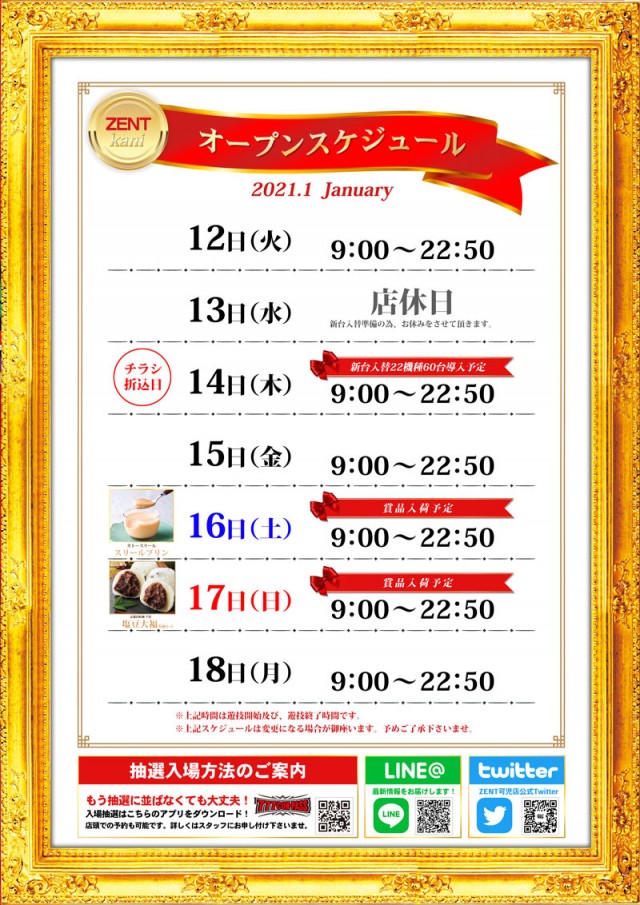 明日1月14日(木)新台入替初日!朝9時開店!