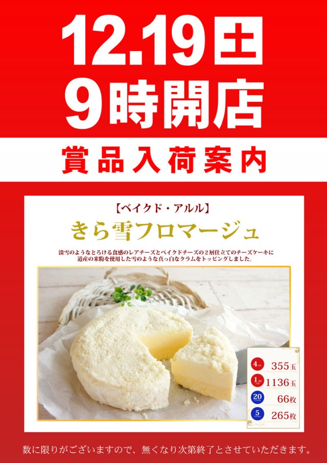 明日12月19日(土)朝9時開店!スイーツ賞品入荷♪
