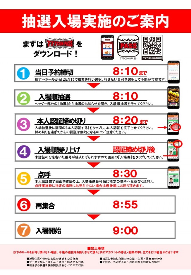 8:30までにお集まりいただいた方を対象に現地で機械を用いて抽選を行います。 |