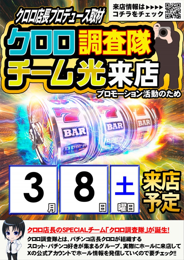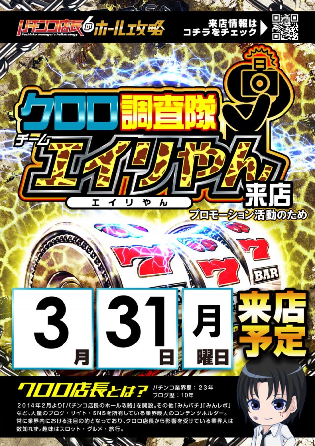 3月31日(月)クロロ調査隊エイリやん来店予定!