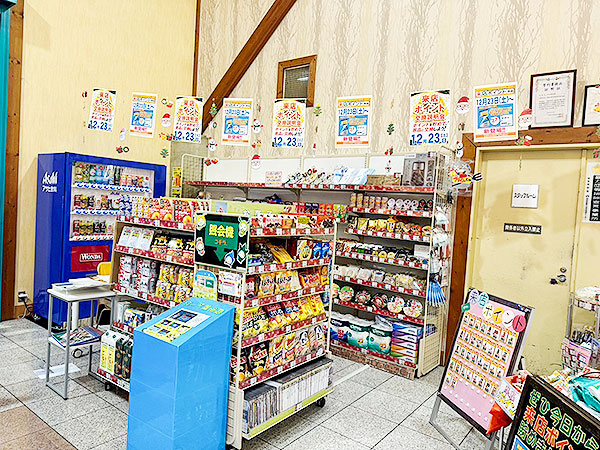 景品コーナーにはお菓子・インスタント食品・酒類など多彩なアイテムが並んでおり、プレイヤーたちの興味をそそっていた。