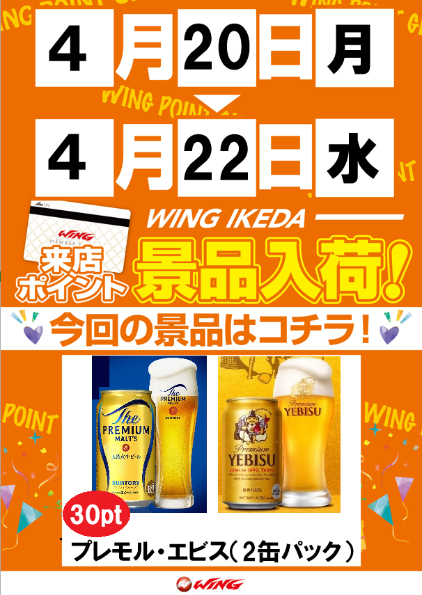 20日~22日はポイント景品プレモル・エビス入荷予定!!