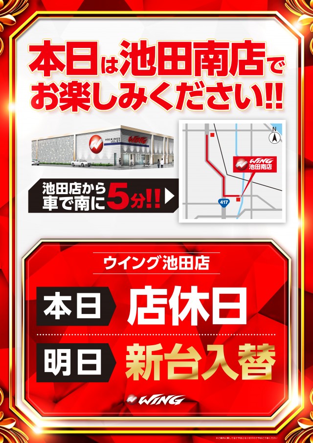 ウイング池田店 明日は新台入替( *´艸`)