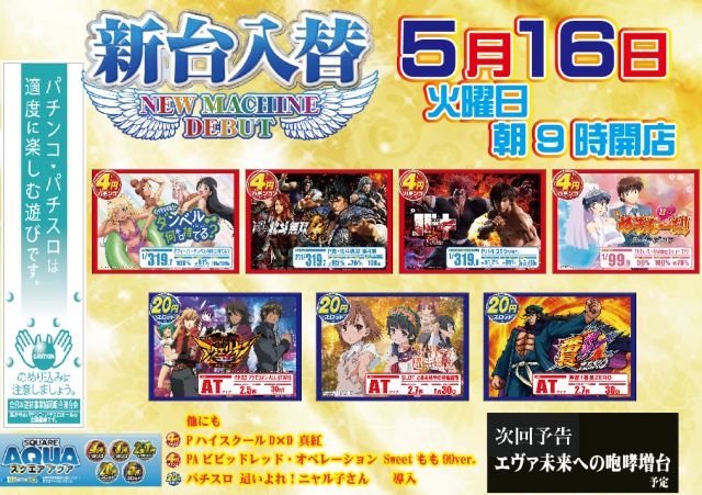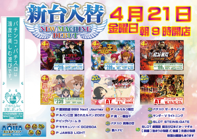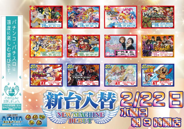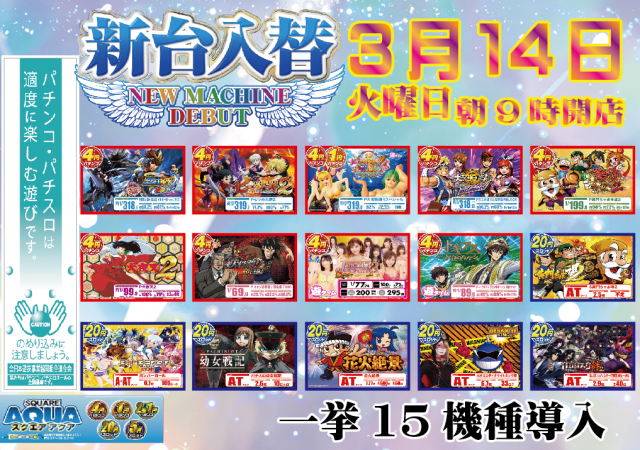 スクエアアクア新台入替初日。本日朝9:00開店。