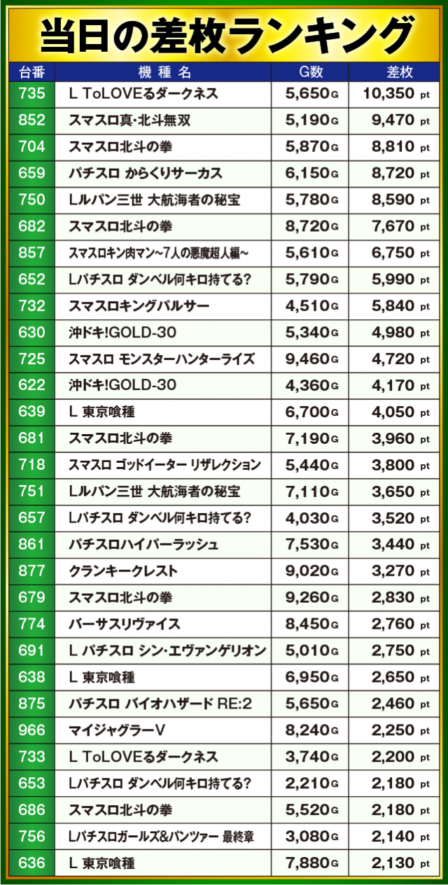 ※差枚数順に掲載しています