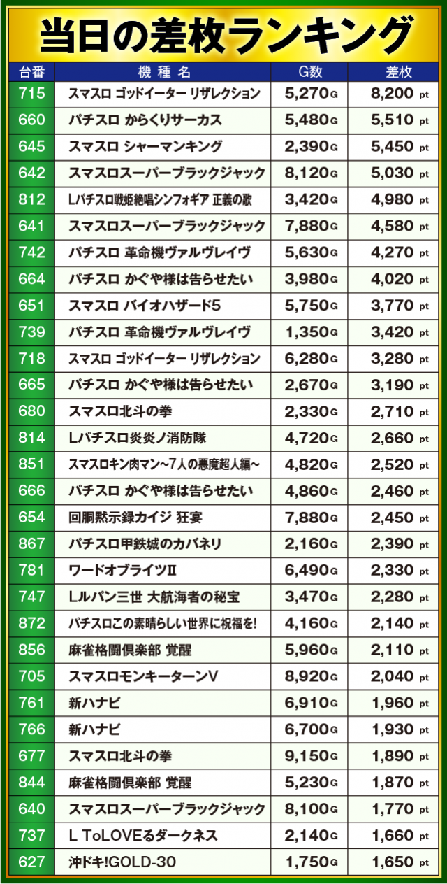 レポートの最後に「Super D’STATION倉賀野店」の差枚ランキングも掲載!