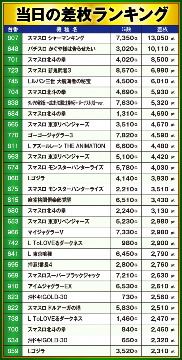 レポートの最後に「Super D’STATION倉賀野店」の差枚ランキングも掲載!