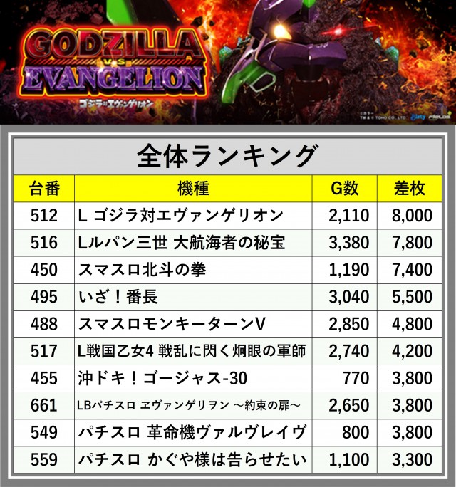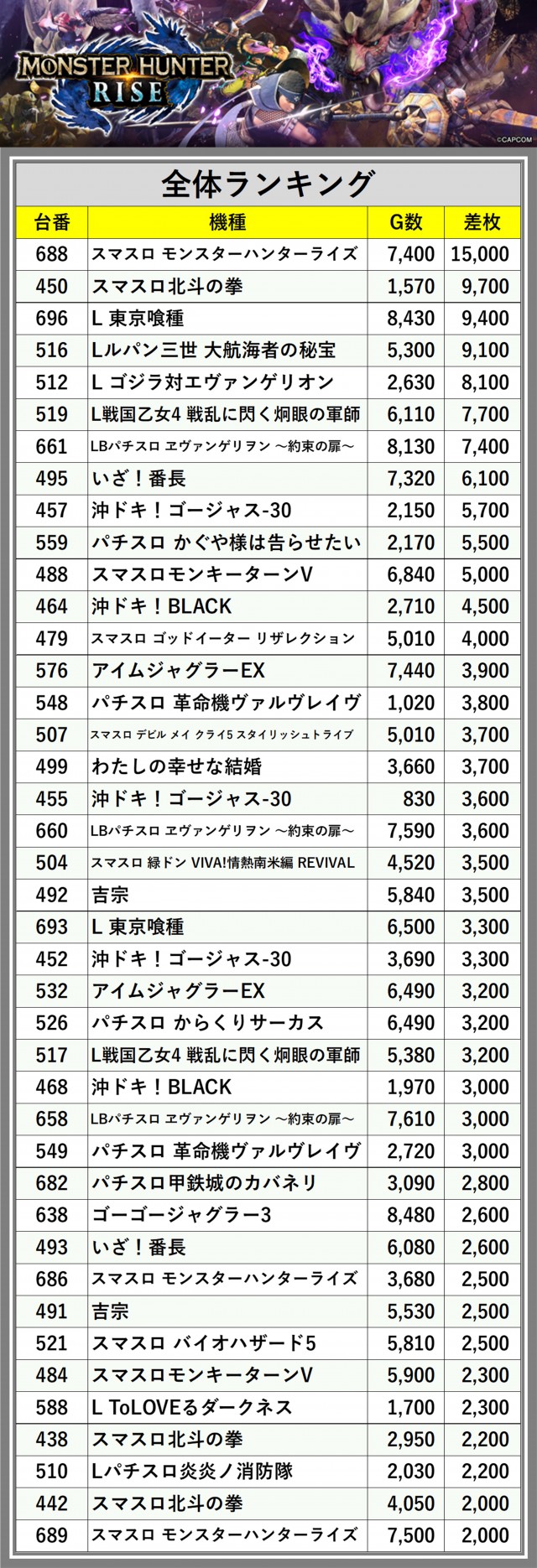厳選された取材対象機種をはじめ、その他スロット全体から好記録が飛び出した!プレイヤーが楽しんだ1日を下記データにて振り返ってみて欲しい。