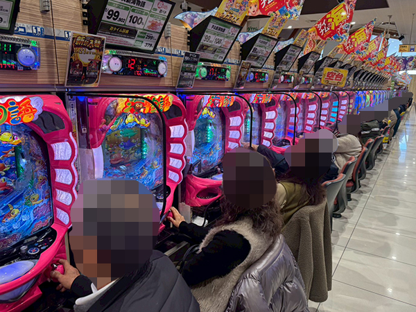 午後の1円パチンコをチェックすると、「PA新海物語」や「PAスーパー海物語 IN 沖縄5 夜桜超旋風 99ver.」が盛況の様子。プレイヤーたちの満足気な表情が印象に残っている。