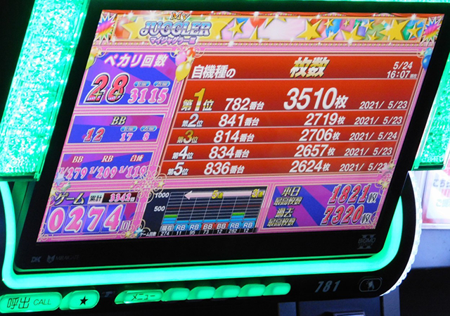 16時頃にデータカウンターをチェックすると、ボーナス当選回数が28回と30回の台があり、ボーナス合算確率はどちらも1/120を上回っていた。