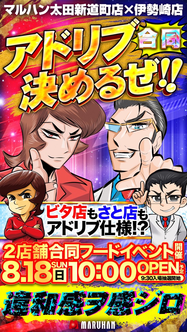 本日8月20日(火)太田新道町店×伊勢崎店 合同新台入替予定