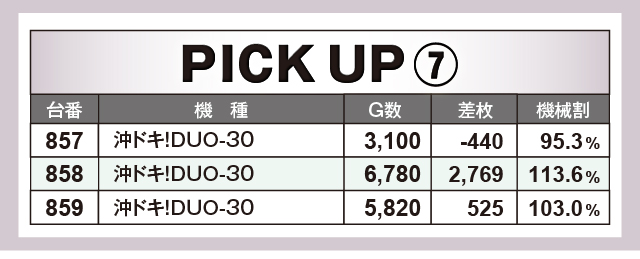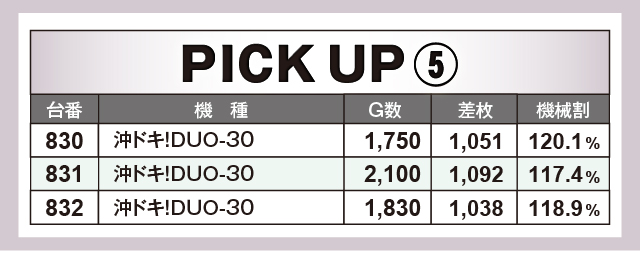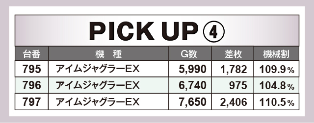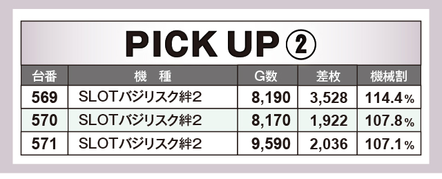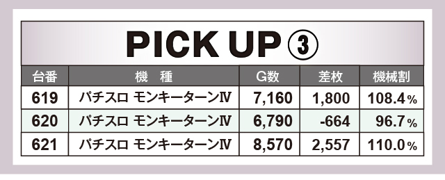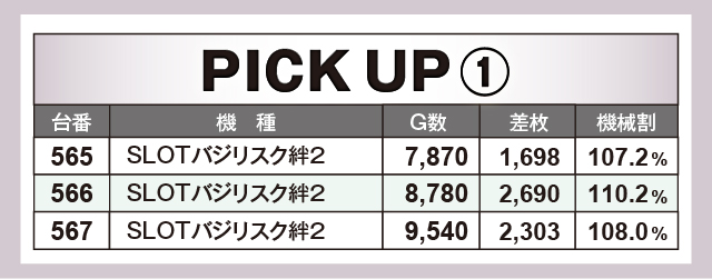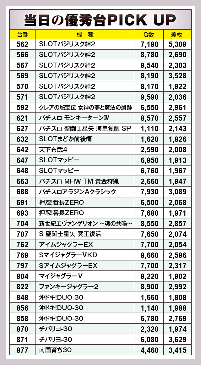 ピックアップ機種では、『SLOTバジリスク〜甲賀忍法帖〜絆2』、『パチスロ モンキーターンⅣ』、『アイムジャグラーEX』、『沖ドキ!DUO-30』が並びで活躍していた。