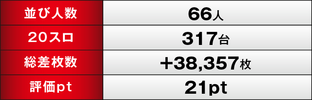 パチスロは全体的に好調で、トータルの差枚数は+38,357枚を記録。評価ptも21ptを獲得した。このまま連勝をどこまでも伸ばして行きたいところだ。