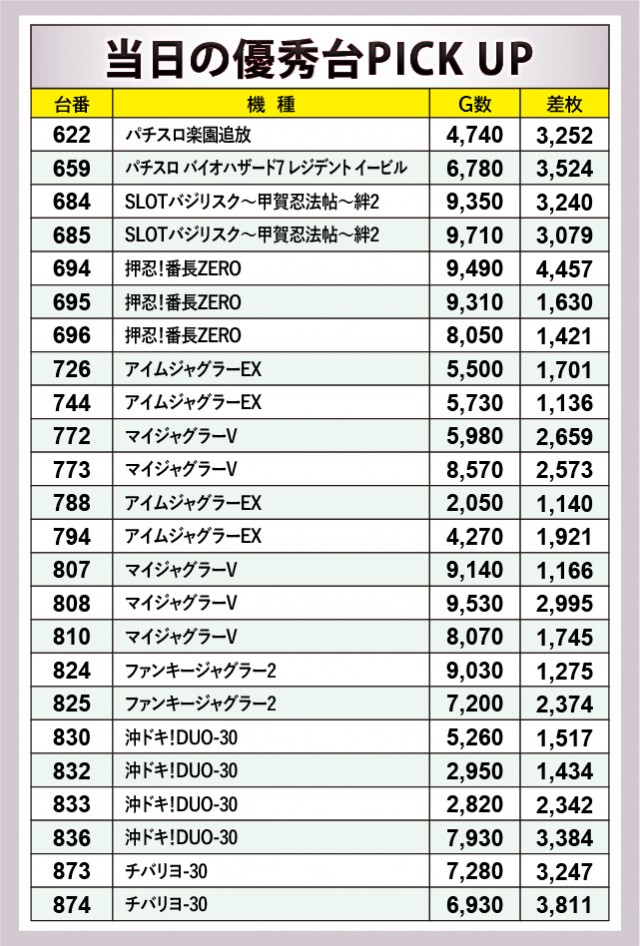 『SLOTバジリスク~甲賀忍法帖~絆2』『押忍!番長ZERO』といった定番機種の活躍はもちろん、今回特に目立っていたのは『ジャグラー』シリーズと沖スロ機種だった。『マイジャグラーV』『アイムジャグラーEX』の両機種が安定のパフォーマンスを披露し、『チバリヨ-30』でも3千枚OVERが複数発生。上表以外の機種もドル箱に手が伸びる状況で、館内全体が熱気に包まれていたと言える。