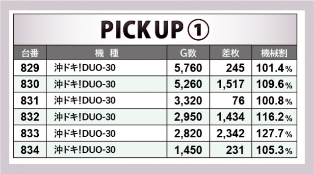『沖ドキ!DUO-30』に注目すると、829番台~834番台の横並びが全台プラス差枚を達成していた。836番台の+3,384枚という突出した数字も目に付くなか、それ以上に分かりやすい好況として、ファンの目に焼きついたのではないだろうか。コンスタントに輝くハイビスカスに心が癒されるばかりか、右肩上がりに伸びるメダルを前にして興奮が高まっていった様子も想像にたやすい。