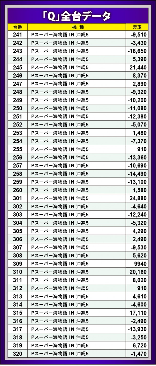 シリーズの中でも屈指の人気を誇る『Pスーパー海物語 IN 沖縄5』では、半数近くの台がプラス差玉を記録する結果となった。2万発OVERを記録する台も確認でき、王道機種ながら高いポテンシャルを披露していたと言えるだろう。総差玉数こそマイナスに沈んでしまっているが、コンスタントな大当りが発生していたのは間違いなく、笑顔の華が咲き乱れていた一角だ。