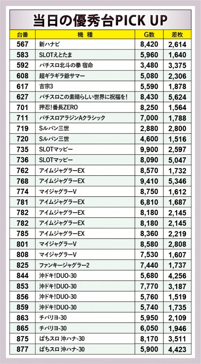 当日は『ジャグラー』シリーズや沖スロ機種の活躍が目立っていた。他にも『パチスロこの素晴らしい世界に祝福を!』+5,624枚や『新ハナビ』・『超ギラギラ爺サマー』のような新旧問わない機種群も熱気を放っており、各所で力強くレバーを叩く様子が印象に残る。もちろん、『押忍!番長ZERO』『SLOTバジリスク~甲賀忍法帖~絆2』の二大巨頭の人気も高く、各々が有意義な時間を過ごしていた。