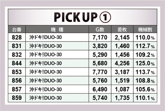 全32台設置の『沖ドキ!DUO-30』では、千枚OVER台が多発する状況となっていた。844番台+4,256枚や853番台+3,187枚など、しっかりと結果を残しているところを鑑みれば、手ごたえを感じられるエリアだったと想像できるはずだ。7千回転OVERの台が見られる点からも、充実した内容を得られたのは間違いない。