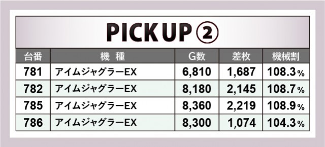 一方で『アイムジャグラーEX』では、安定した数字を残す台を確認できる。こちらは最多設置となる全59台の機種で、その中でも781~782番台・785番台~786番台の4台は横並びでのプラス差枚を達成!他にも横並びで活躍する台が見られるなど、チャンスの塊が存在している状況はファンにとって察知しやすかったのではないだろうか。