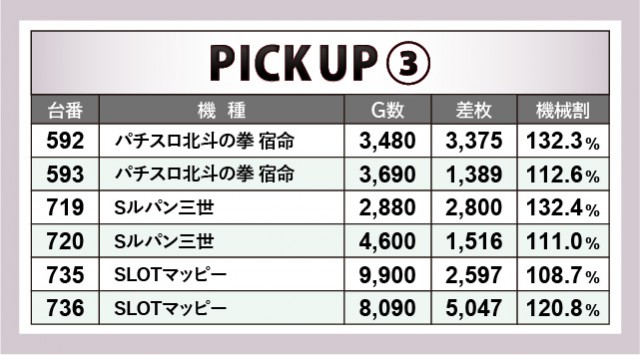 『パチスロ北斗の拳 宿命』『Sルパン三世』『SLOTマッピー』でも連続で熱気を放つ場所が見られたので触れておこう。特筆すべきは『SLOTマッピー』で、735番台+2,597枚・736番台+5,047枚を確認でき、両台とも相当な手ごたえを感じられたに違いない。もちろん『パチスロ北斗の拳 宿命』『Sルパン三世』も同様で、しっかりと結果を得られたことに遊技したファンは恍惚の表情を浮かべていたことだろう。