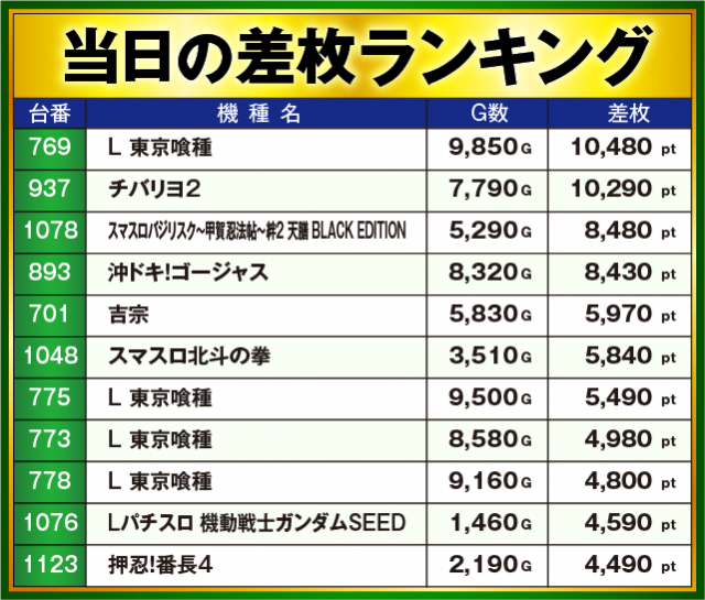 ※差枚数順に掲載しています