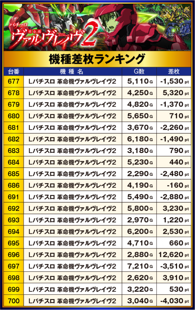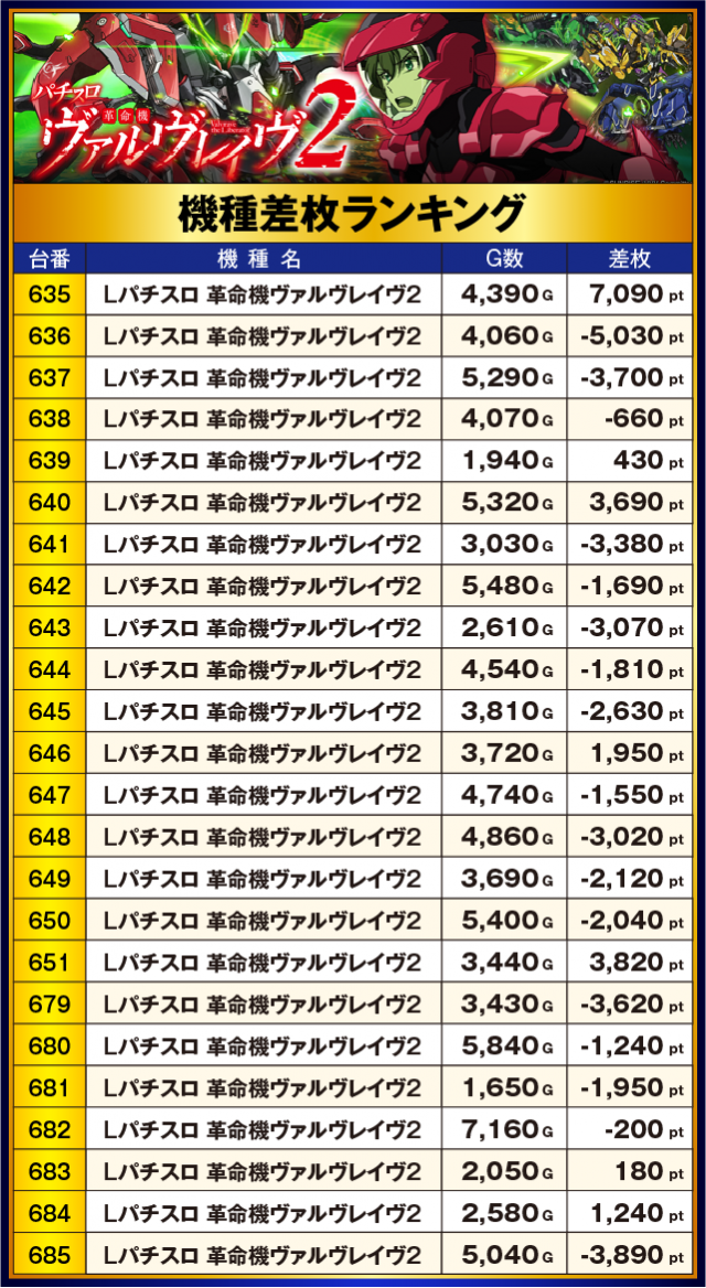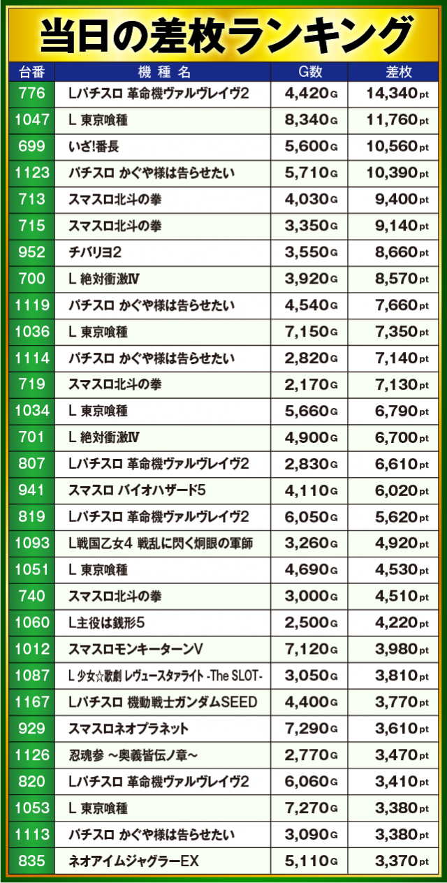 Super D’STATION前橋大利根店 差枚ランキング(11月30日)