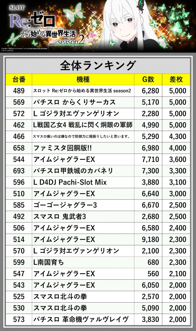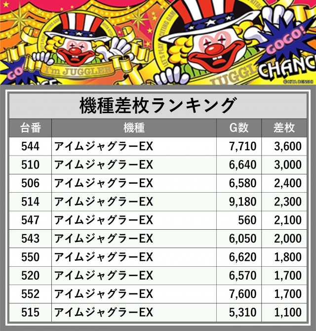 ※差枚数順に掲載しています