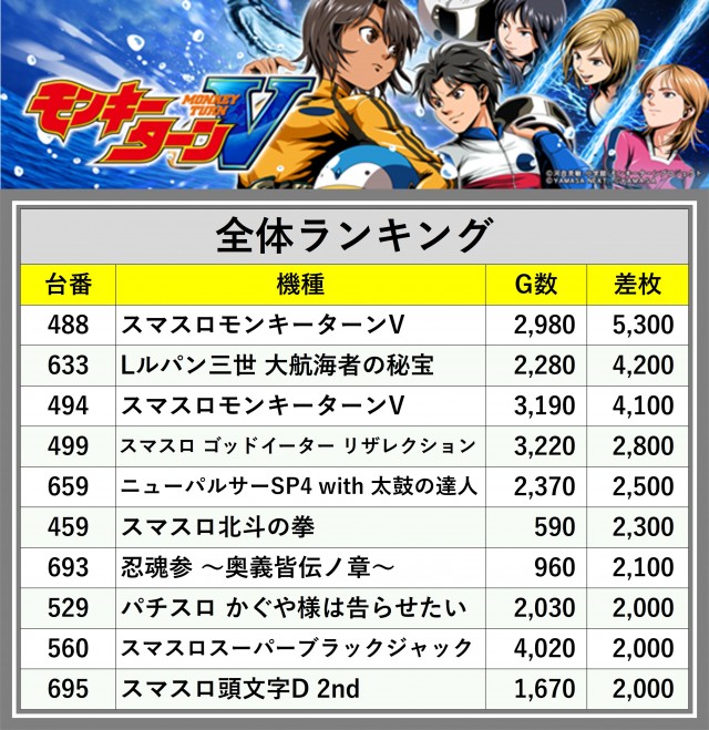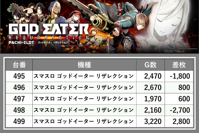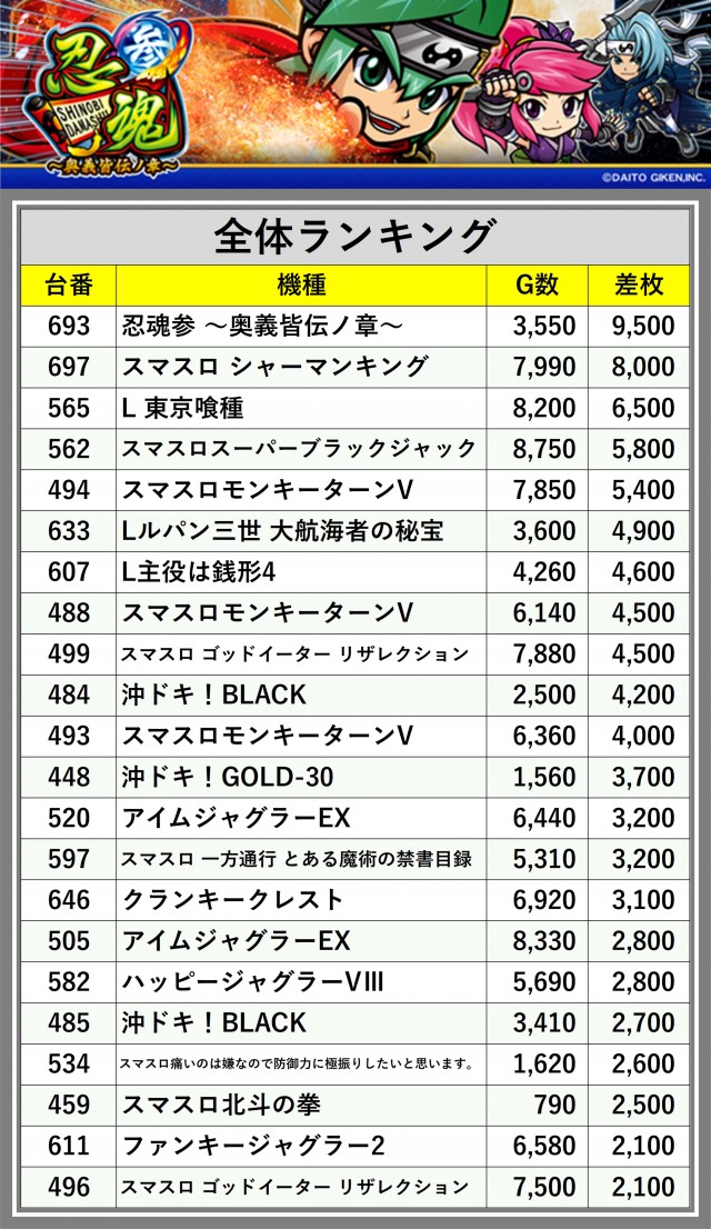 厳選された取材対象機種をはじめ、その他スロット全体から好記録が飛び出した!プレイヤーが楽しんだ1日を下記データにて振り返ってみて欲しい。
