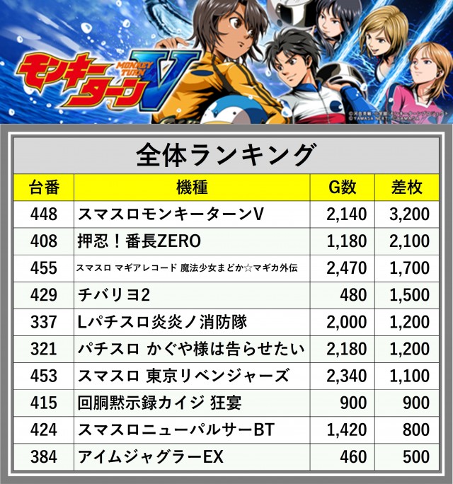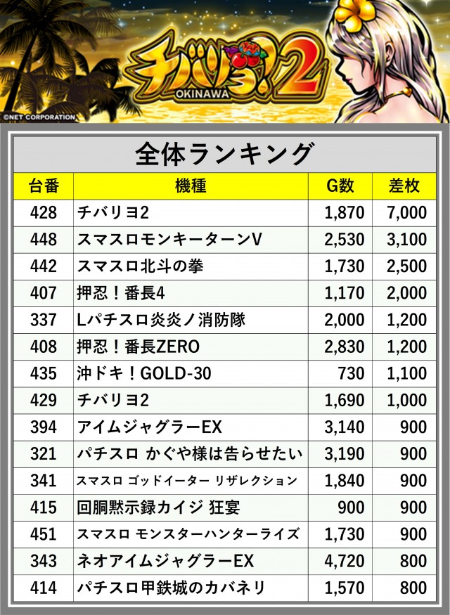 厳選された取材対象機種をはじめ、その他スロット全体から好記録が飛び出した!プレイヤーが楽しんだ1日を下記データにて振り返ってみて欲しい。