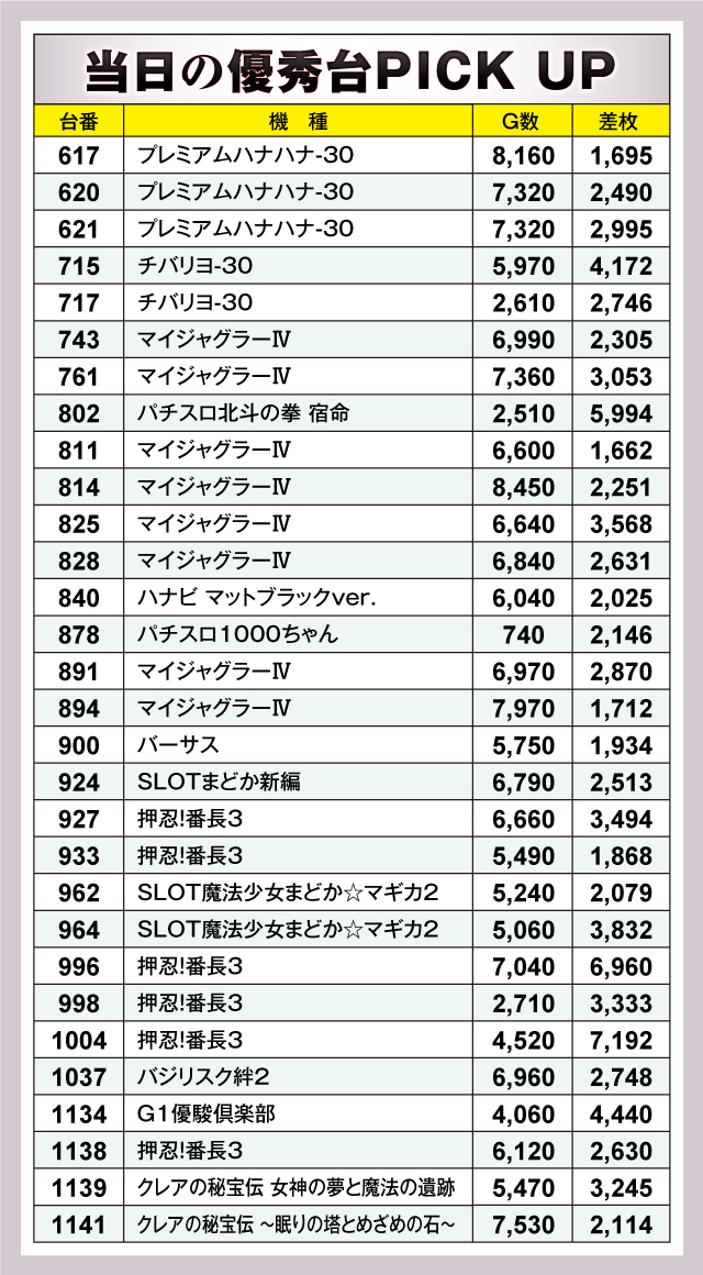 優秀台をチェックしてみると、『マイジャグラーⅣ』の活躍が目立っていた。稼働も出玉も高水準な台を連発しており、英雄を量産していた。また、『押忍!番長3』も、差枚+7,000枚級を2台出すなど相変わらずパワフルだった。