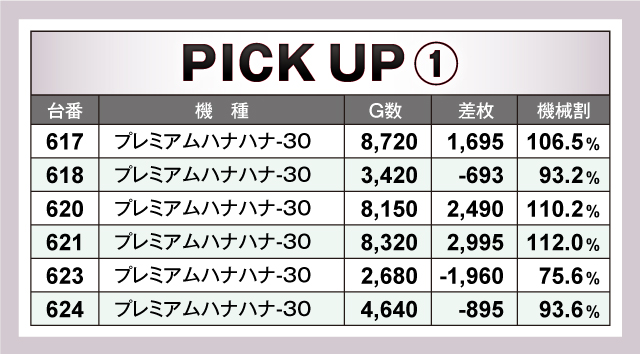 個別に注目したいのは『プレミアムハナハナ-30』。6台中3台がプラスで、プラス台はいずれも差枚+1,000枚オーバーだった。
