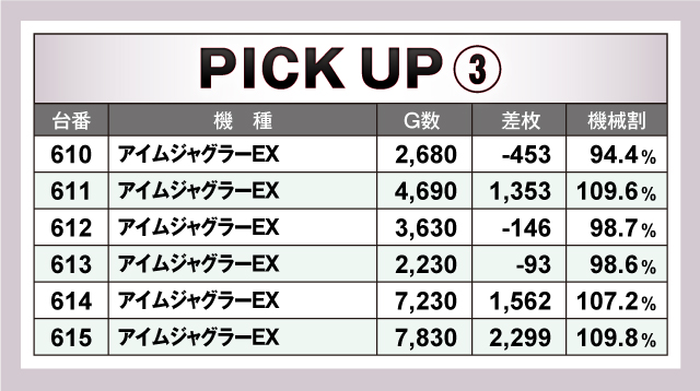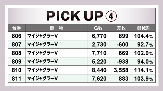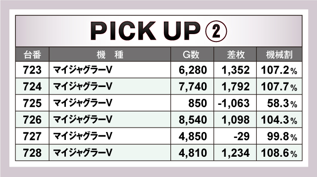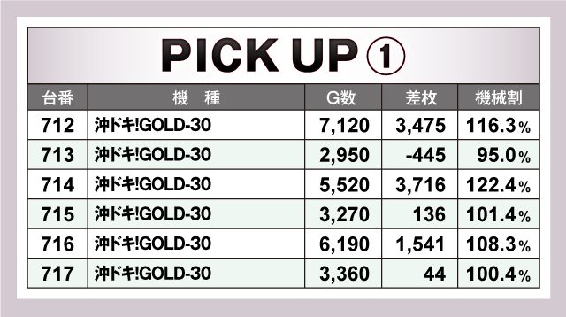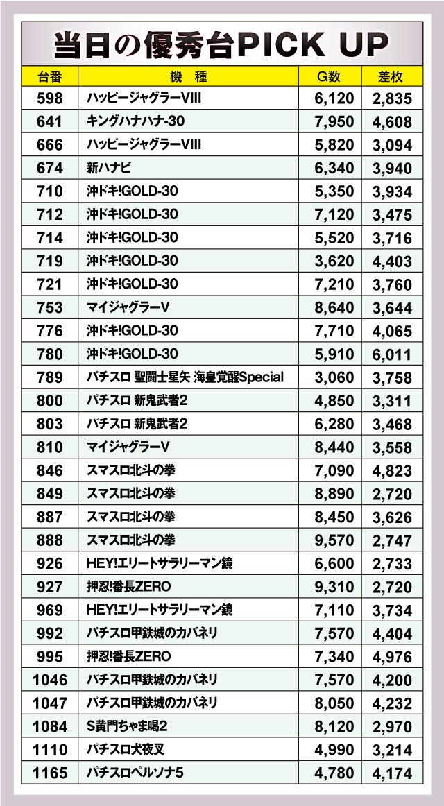 まずは優秀台PICK UP30台の紹介から。当日もっとも差枚数を多く獲得したのは、780番台の「沖ドキ!GOLD-30」の+6,011枚。次いで+4,000枚代が9台、+3,000枚代が14台と、+3,000枚オーバーが24/30台と上々の結果。傾向として、ジャグラーシリーズや「沖ドキ!GOLD-30」が強く、各機種にチャンスが隠されていた可能性が高そうだ!