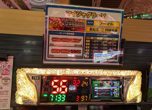 続いては、6台並びで好調だった4箇所を紹介。「沖ドキ!GOLD-30」「マイジャグラーⅤ」「アイムジャグラーEX」の3機種4箇所から6台並びの好データを確認でき、それぞれ全台が絶好調だったとは言えないが、しっかり回されている台が多かった印象だ。このことから、台のポテンシャルは十分にあったことが窺えるので、諦めずに良台をしっかり見極めて立ち回ろう!