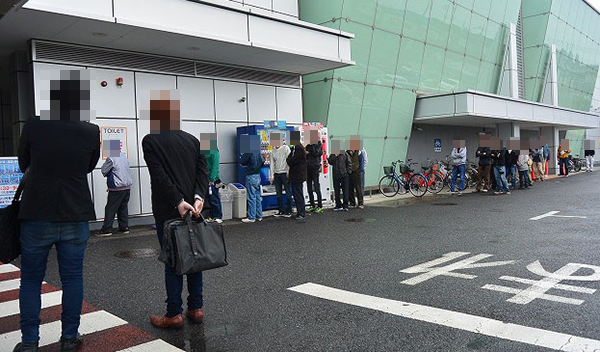 REAL取材Ωの2日目となる19日に集まっていたプレイヤーの人数はおよそ100名。どのプレイヤーも開店を心待ちにしている様子で、ホールに大きな期待を寄せていることが伝わってきた。