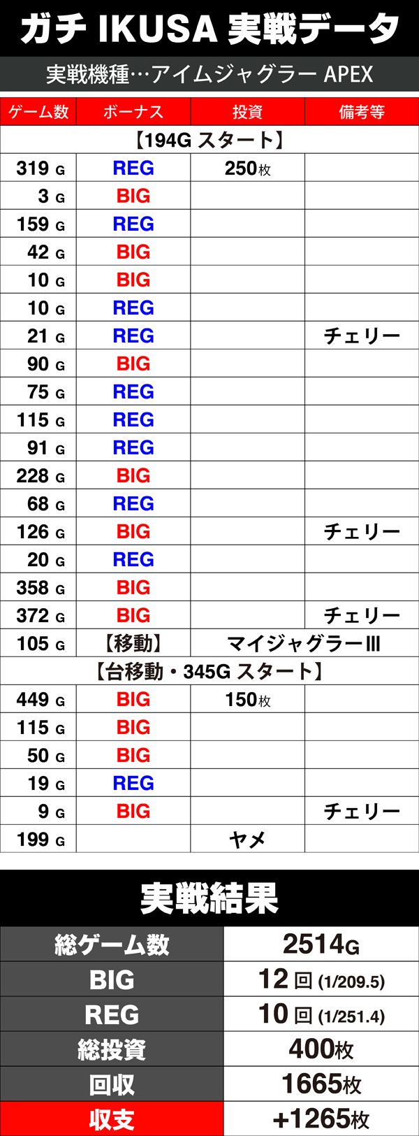 最初に座った「アイムジャグラーAPEX」では序盤から調子が良く、投資250枚で獲得したREGをはじめ、順調にボーナスに当選!