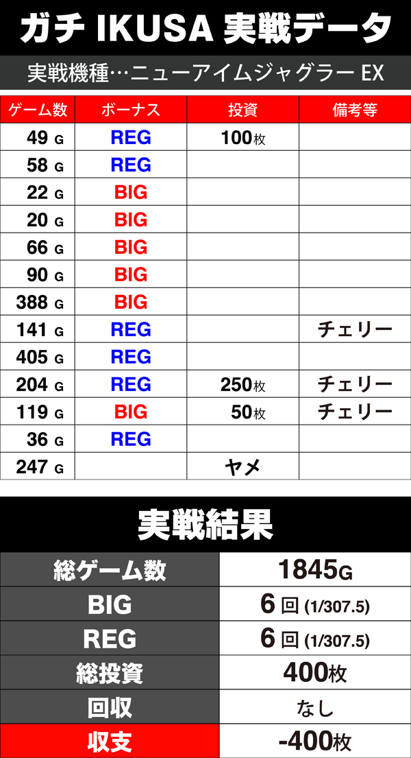 このまま、ボーナス回数を増やし、大きなプラスの差枚になる…と想像していたのだが、最終的にはすべてノマレて実戦終了…。