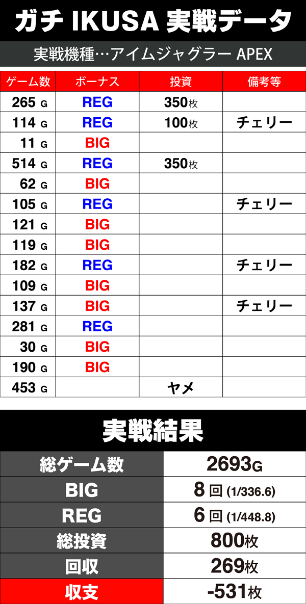 REGが先行かつボーナス合算確率が設定6の数値を超えているということで、高設定に期待が持てる状況であったのだが…展開はイマイチ。