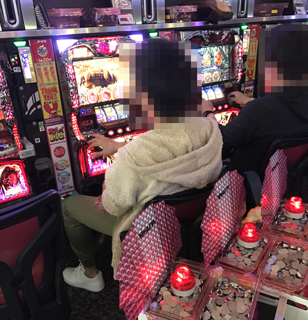 とりあえず、たくさんの人気を集めていることもあり、ジャグラーシリーズのシマをみると「ジャグラーガールズ」に高設定と思われる台を発見した!