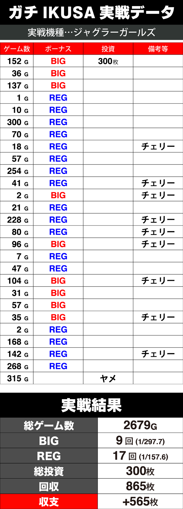 気がついたときにはほぼREGのみで、500枚ほどのプラスの差枚を獲得。実戦終了となった。