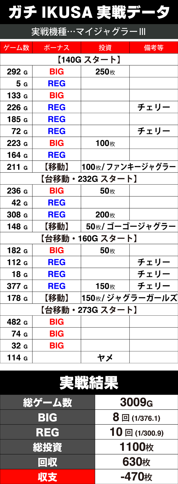しかし、ボーナスのヒキが悪く、出玉を獲得できずに投資ばかりが増えていった。気分を切り替える意味も込めて、設定が良さそうな台につぎつぎと移動し、実戦を続けたものの最終的な結果はマイナス。
