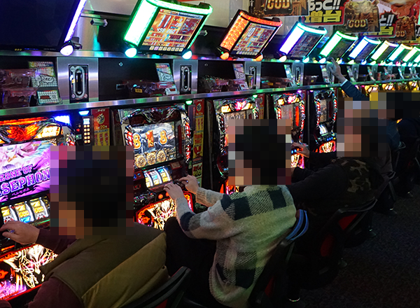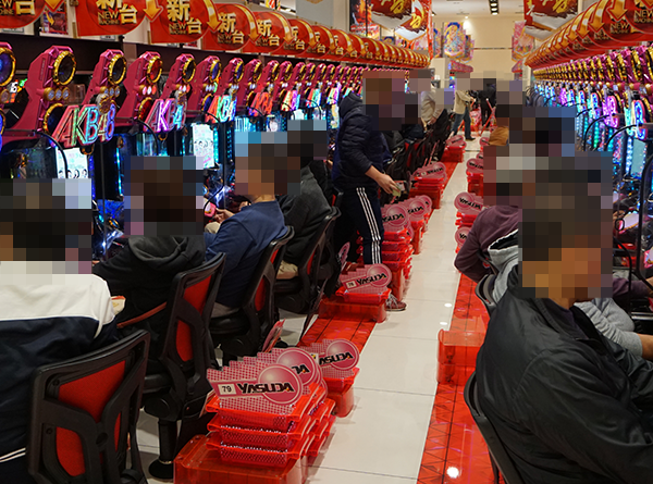 16時頃の4円パチンコにおいては、「ぱちんこCR真・北斗無双」や「CR牙狼TUSK OF GOD」、「CRぱちんこ AKB48-3 誇りの丘」など、満席の機種が多数。ポテンシャルを発揮しているといったプレイヤーが多く、鮮やかな光景が広がっていた。