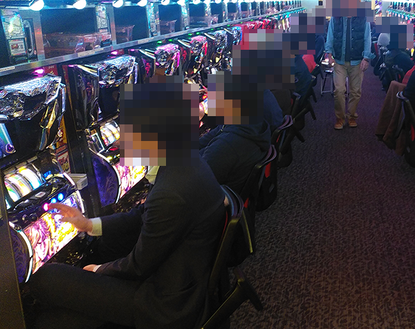 設置されている6台がフル稼働。シマの端から中央に向かって輝くような笑顔が並んでおり、遊技をおこなっているプレイヤーに対してうらやましさも覚えた。