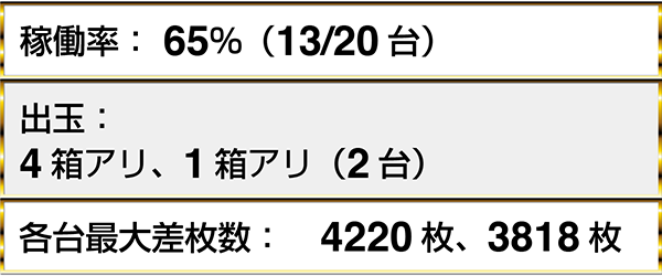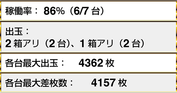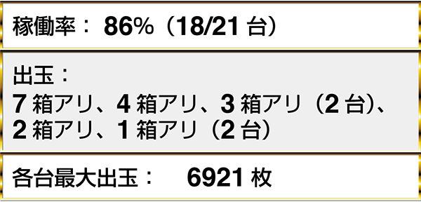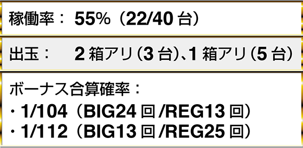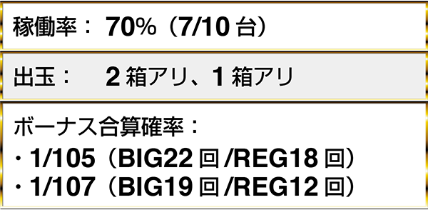 ジャグラーシリーズも厚く支持されており、『ゴーゴージャグラー』や『ファンキージャグラー』などでボーナス合算確率1/120以上のデータがみられた。