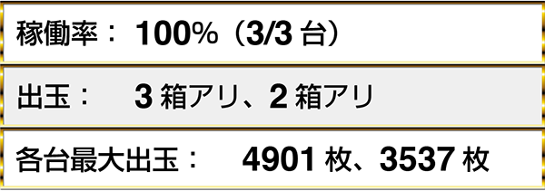 『パチスロ北斗の拳 転生の章』や『バジリスク~甲賀忍法帖~絆』、『アナザーゴッドハーデス-奪われたZEUSver.-』など、4機種以上で3箱overの出玉を獲得しているプレイヤーを目にした。
