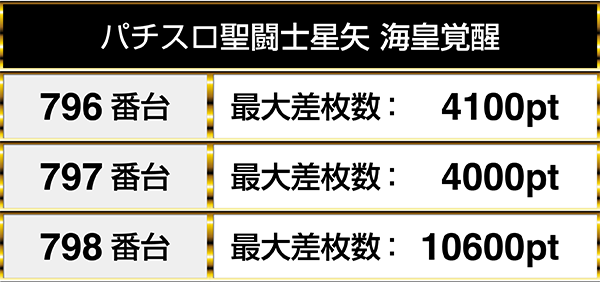 『パチスロ聖闘士星矢 海皇覚醒』も3台並びでプラスpt。いずれも4000ptを上回っており、そのうちの1台は最終データが10000ptオーバーとなっていた。
