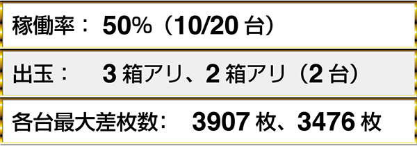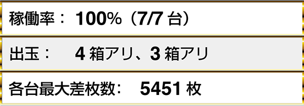 確認時にもっとも多かった出玉は『パチスロ聖闘士星矢 海皇覚醒』と『マイジャグラーⅢ』の4箱。