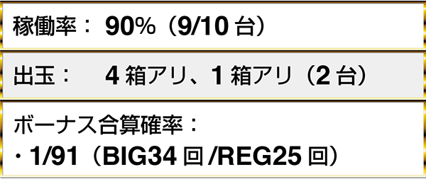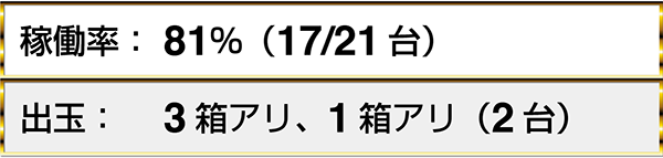 『バジリスク~甲賀忍法帖~絆』や『沖ドキ!』など、あわせて5機種以上で3箱を上回る出玉を確認した。