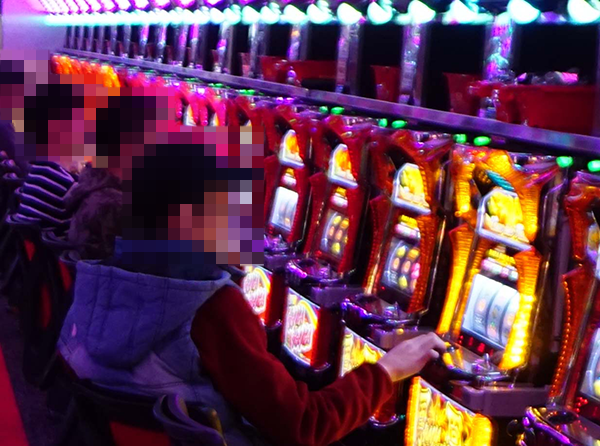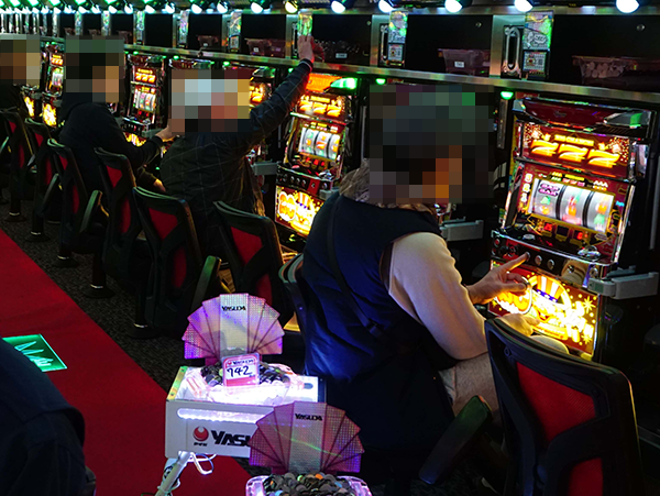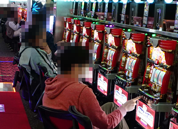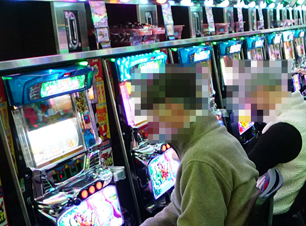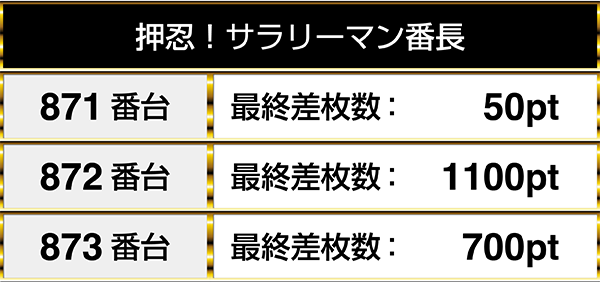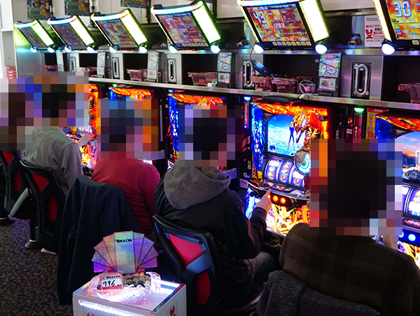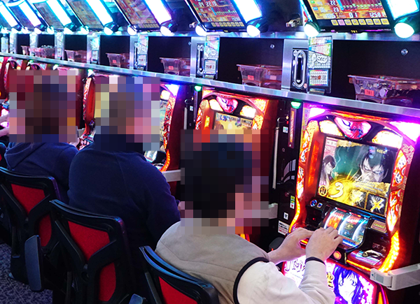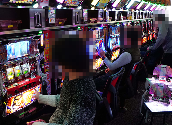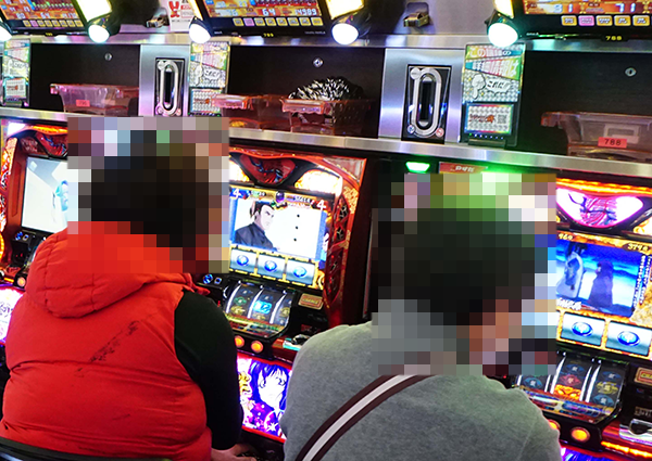 『押忍!サラリーマン番長』で遊技をおこなうプレイヤーの華麗なパフォーマンスも印象的。3台が並んでこの日をプラスptで終えており、機種全体では8台中4台にプラスptのデータが残っていた。