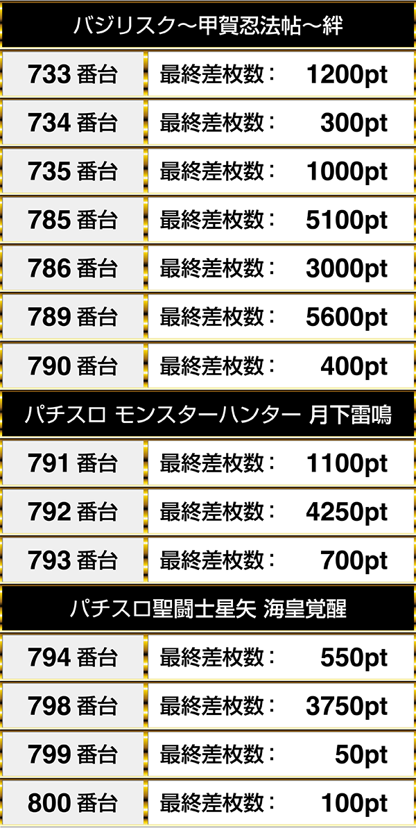 『バジリスク~甲賀忍法帖~絆』と『パチスロ モンスターハンター 月下雷鳴』、『パチスロ聖闘士星矢 海皇覚醒』の3機種にまたがり、6台が並んでプラスptを記録!