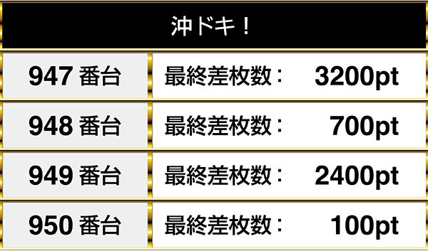 『沖ドキ!』でも、機種のポテンシャルを発揮しているといった素敵なシーンを確認済み。閉店時のデータでは、4台が並んでプラスptとなっていた。
